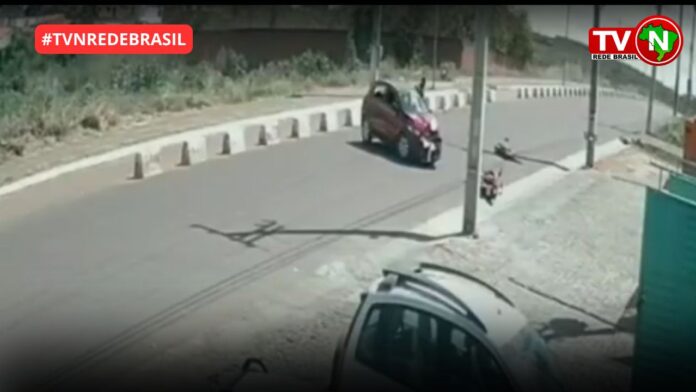 Imagens de câmeras de segurança mostram o momento em que o condutor de um carro de passeio tenta acessar a entrada de um residencial. No mesmo instante, o motociclista seguia na direção contrária e não conseguiu desviar a tempo, colidindo frontalmente com o veículo.
